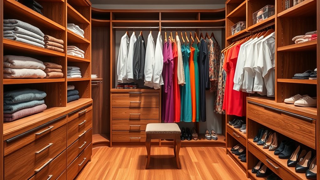 An organized closet helps you save time, reduce stress, and boost confidence by making everything easy to find. Custom shelving maximizes space, giving each item a designated spot, while proper lighting brightens the area and highlights features. When combined, these systems create a functional and inviting space that simplifies your daily routine. If you keep exploring, you’ll discover how to transform your closet into a true personal sanctuary tailored to your needs.
