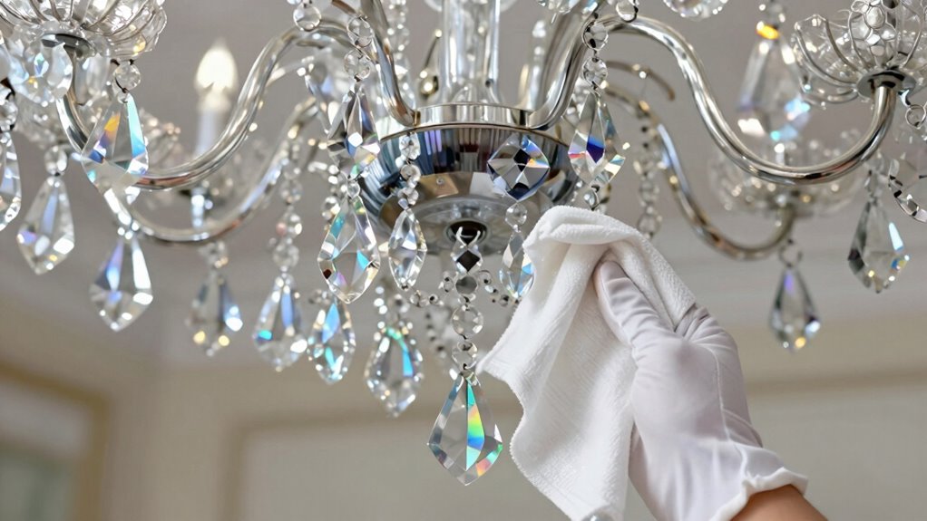 To prevent damage to delicate crystals, you should focus on crystal preservation by using gentle techniques. Handle the crystals carefully, avoiding harsh scrubbing or abrasive materials. Use a soft, lint-free cloth and a gentle cleaning solution specifically designed for crystal or glass. Support each crystal securely and clean with light, sweeping motions. This approach minimizes the risk of chipping or loosening, ensuring your chandelier remains sparkling and intact.
