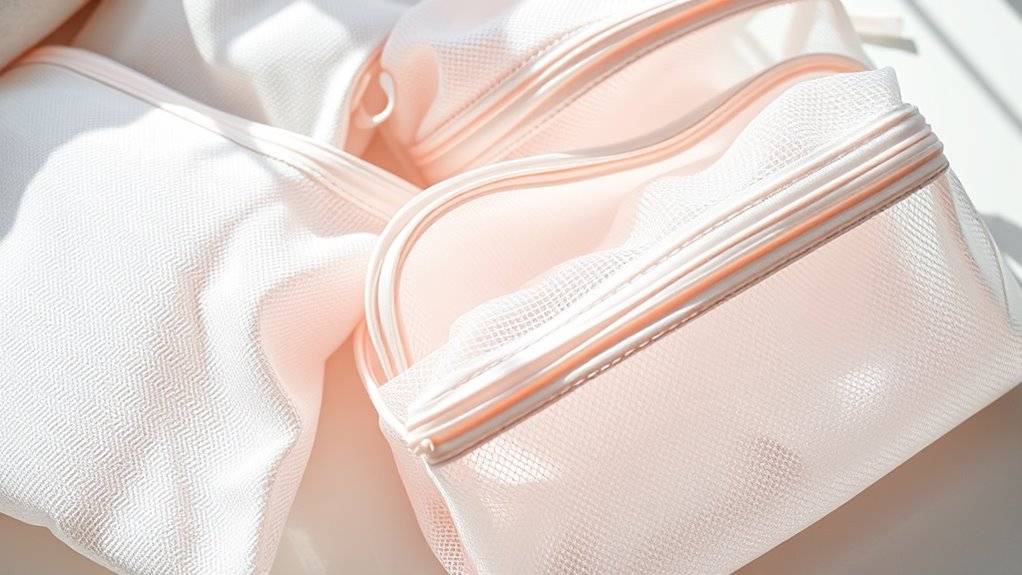 Using delicates laundry bags helps protect your fragile clothes during washing by preventing damage from rough agitation, snagging, or stretching. Choose fine-mesh bags with secure closures and avoid overloading them to allow proper movement. Follow care instructions on garments and use gentle cycles with cold water for best results. Air drying is often recommended. Properly caring for your delicates with laundry bags extends their lifespan and keeps them looking new. Keep exploring to discover more essential tips.