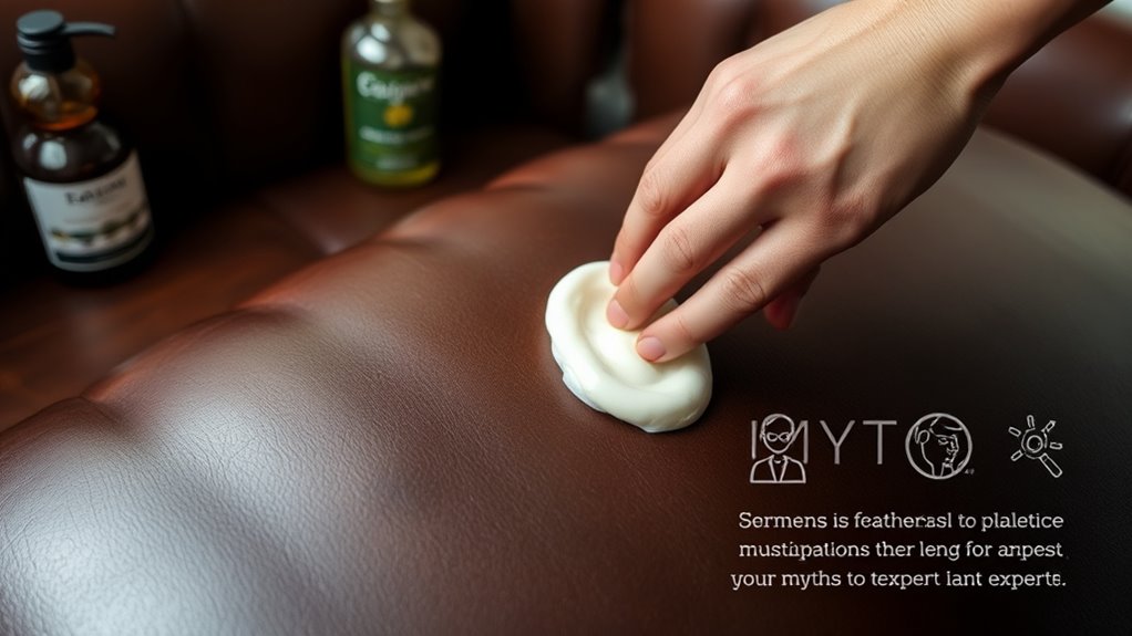 To keep your leather looking its best, condition it regularly—typically every 3 to 6 months, depending on climate and usage. Use quality products designed for leather, applying small amounts in circular motions and testing first on hidden areas. Myths say over-conditioning can damage leather, but with proper products and technique, it helps maintain flexibility and appearance. Wondering how to choose the right products or ideal schedule? Keep exploring to learn all the essentials.