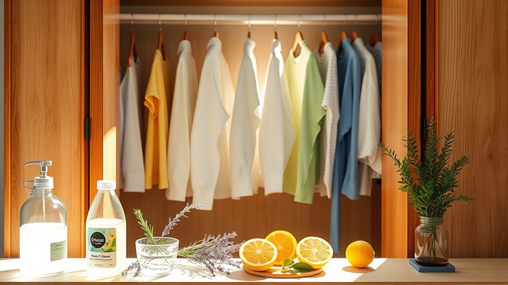 You might wonder if natural remedies can damage delicate fabrics. Unlike fabric softeners and commercial sprays, which sometimes contain harsh chemicals, natural solutions like baking soda or essential oils are gentler. When used carefully, they won’t harm your clothes. Just avoid over-saturating fabrics or applying directly to delicate materials. This way, you keep your clothing safe while naturally freshening your closet without risking damage from strong chemicals.