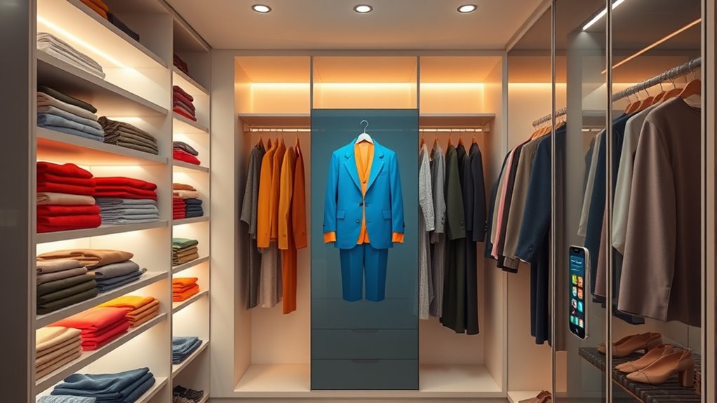 Furthermore, smart closets often integrate with your smartphone or smart home devices, enabling remote access and updates. You can check your wardrobe from anywhere, note new purchases, or plan your outfits ahead of time. This connectivity keeps your wardrobe current and organized, even when you’re away from home. It also encourages better wardrobe management, so you buy only what you need and avoid clutter or impulse purchases that can disrupt wardrobe organization. Additionally, understanding clothing care is essential to maintain your wardrobe in optimal condition over time.