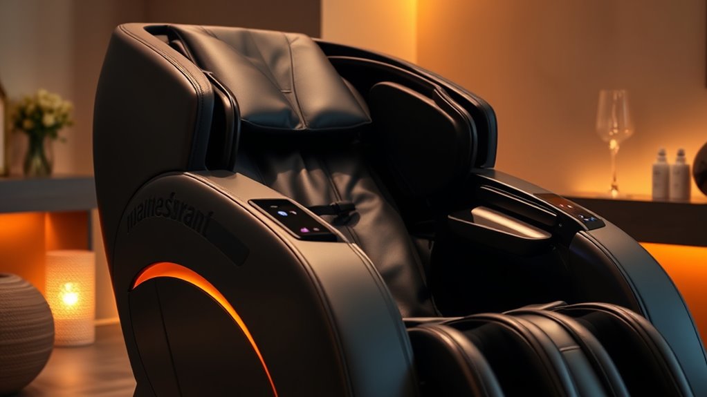 To guarantee a comfortable and effective massage experience, it’s vital to look for a chair that offers adjustable features to fit your body perfectly. I recommend choosing models with adjustable shoulder width and height settings so you can customize the fit for your body type. Multiple reclining positions and footrest adjustments help achieve ideal ergonomic alignment, reducing strain and enhancing comfort. Personalizable airbags and rollers allow you to control intensity and target specific areas, ensuring your massage feels tailored and relaxing. Look for chairs with adjustable zero gravity positions, which help reduce spinal pressure and improve circulation. Lastly, having customizable massage programs and manual controls gives you the flexibility to fine-tune your experience, making your relaxation seamless and personalized.