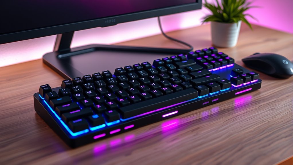 Backlight customization options can substantially enhance your typing experience by allowing you to personalize the appearance and functionality of your keyboard. Many 75% keyboards offer customizable RGB or backlit modes, letting you choose static, dynamic, or music-synced effects. Some models support extensive color options and multiple lighting zones, so you can craft a unique aesthetic. Adjustable brightness, speed, and flow rate give you precise control over lighting intensity and animation pace. Software or dedicated controls typically enable you to create and save custom lighting profiles for different tasks or moods. Beyond aesthetics, backlit options improve visibility in low-light environments and can boost gaming immersion. Ultimately, the right lighting customization can make your keyboard feel more tailored to your style and needs.