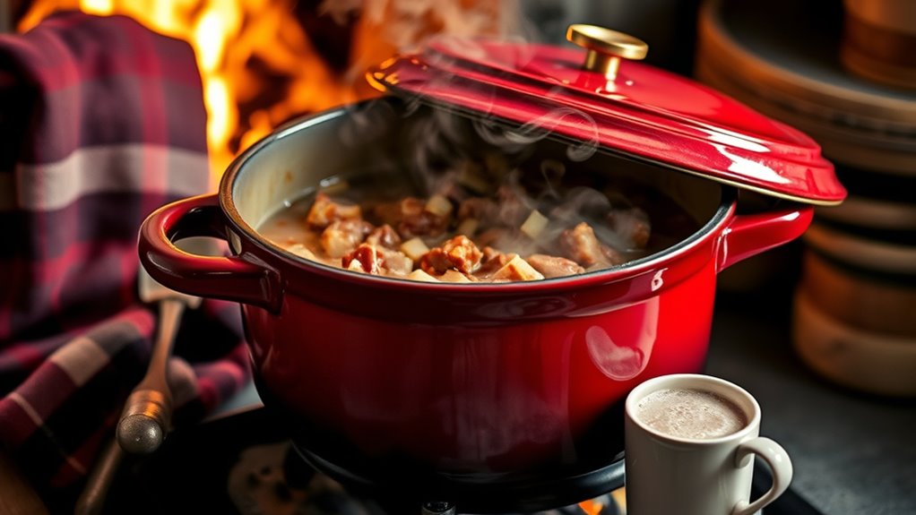 Since a beautiful Dutch oven can elevate your winter stew presentation, it’s worth considering its aesthetic appeal alongside functionality. An attractive 7-quart Dutch oven with vibrant enamel finishes can make your dishes look even more inviting. The color and design should complement your kitchen decor for a cohesive look. Features like smooth, glossy coatings and decorative handles add visual charm, making the cookware a decorative piece when not in use. Elegant, timeless designs not only serve as functional cooking tools but double as attractive serving dishes for winter gatherings. The overall look of your Dutch oven can help create a warm, inviting kitchen atmosphere during the colder months, making every meal feel special and cozy.