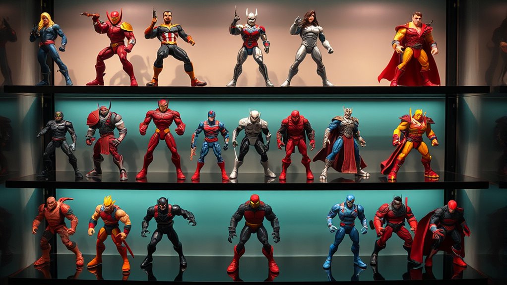 Size and scale set the foundation for how action figures look and fit into your collection, but their articulation and posing capabilities truly determine how dynamic and life-like they can be. The number of articulation points directly impacts a figure’s ability to adopt realistic poses; more joints mean greater flexibility. Fully articulated figures often feature over 20 joints, allowing for expressive positioning perfect for display or play. Key areas like shoulders, elbows, hips, knees, and the neck are essential for recreating action scenes or character stances. The quality of joint design, whether ratchets or ball joints, influences stability and range of motion. Posing versatility depends on how well a figure can hold complex stances without becoming fragile or loose, making articulation a *crucial* factor in choosing collectibles.