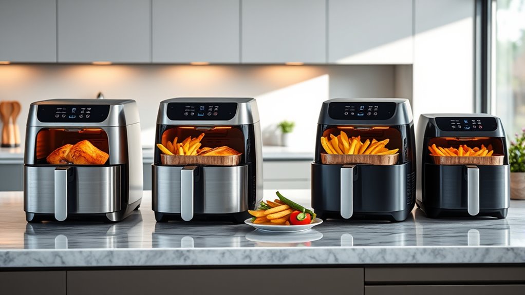 Finding the perfect large-capacity air fryer for my family felt like discovering a hidden treasure chest. With so many options, I considered size, features, and ease of cleaning—much like a seasoned explorer steering uncharted waters. Whether you choose a sleek model or a multifunctional combo, I bet you’ll find your culinary quest easier than ever. Just remember, in this modern age, a trusty air fryer is truly a kitchen’s best companion—no need for a time machine.