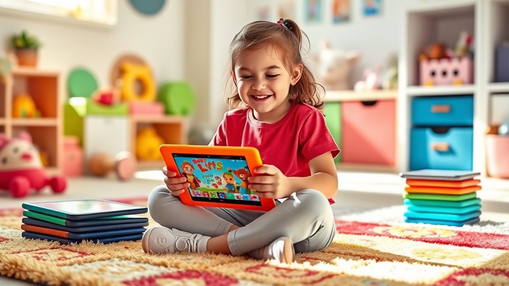 Think of accessories as the magic wand that transforms your child’s tablet experience. I recommend a sturdy, child-friendly case to protect against drops, a screen protector to prevent scratches, and a stylus for creative play. Additionally, investing in a pair of kid-friendly headphones enhances focus and fun without disturbing others. These extras turn a simple device into a safe, engaging, and personalized adventure for your little explorer.