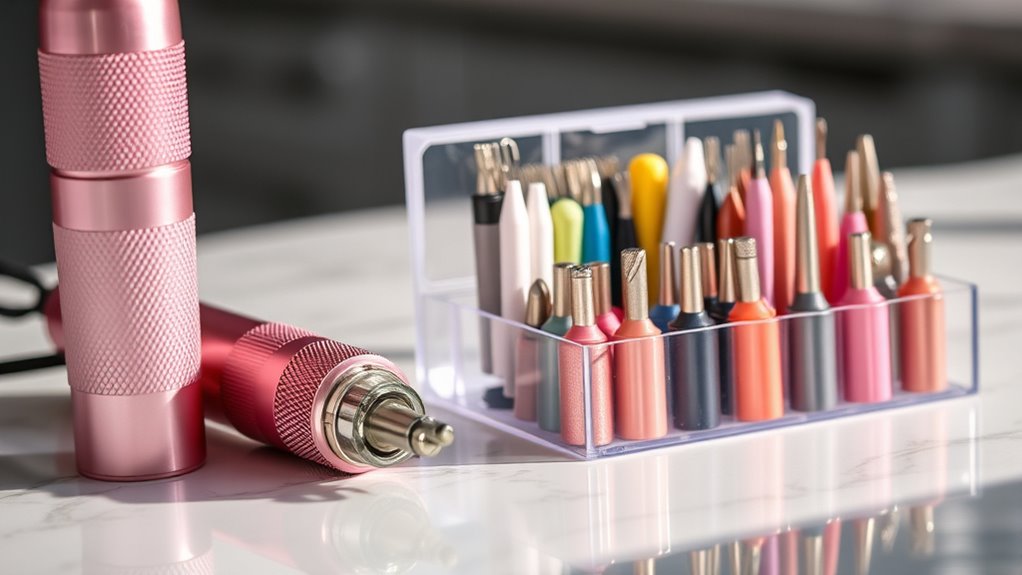A crucial factor when shopping for at-home nail drill kits is guaranteeing they come with a variety of useful accessories. I look for kits that include different drill bits, such as carbide, ceramic, or sanding bands, to handle various nail prep and removal tasks efficiently. Compatibility is key, so I check that these bits fit standard shank sizes (usually 3/32”) for versatility. It’s also helpful if the kit provides nail files, buffers, and cuticle pushers, which complement the drill and create a polished look. Additional attachments like polishing heads or shaping bits expand your styling options, making your routine more creative. Ultimately, I make certain the kit includes replacement sanding bands and drill bits, so I can maintain effectiveness and hygiene over time without needing extra purchases.