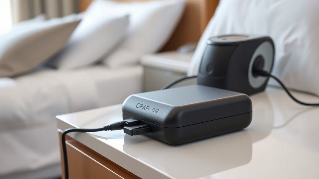 Ensuring compatibility between your CPAP machine and a backup battery requires careful attention to voltage, connection types, and power input specifications. First, check that the battery supports your CPAP’s voltage and has the right connection ports. Using incompatible connectors can prevent proper power transfer or damage your device. Next, verify that the battery’s watt-hour capacity can sustain your typical nightly use. Also, ensure it includes the necessary cables or adapters for your specific model. If you use features like humidifiers or heated tubing, confirm the battery can handle the additional power load. Ultimately, consider the battery’s size and weight to ensure it’s suitable for travel and complies with airline regulations for carry-on items. These factors help guarantee your backup powers your CPAP reliably and safely.