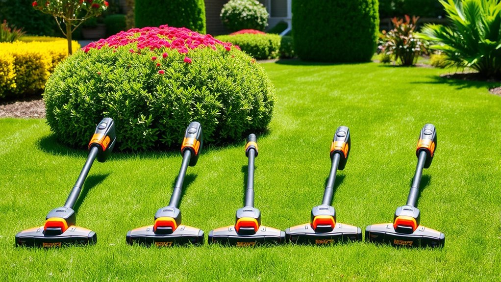These battery-powered trimmers operate as quietly as a whisper, making yard work feel less like a battle and more like a breeze. Compared to gas-powered tools, they produce markedly less noise, which means I can trim my yard without disturbing the neighbors or my own peace. It’s like having a secret weapon—powerful yet peaceful—allowing me to tackle chores without the roar of traditional engines.