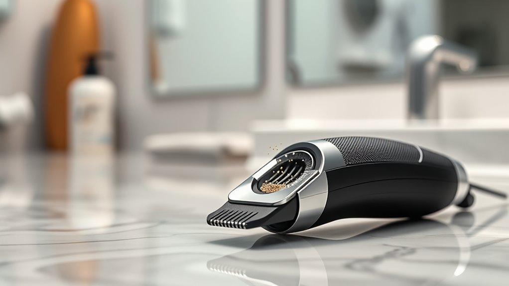 When choosing a beard trimmer with vacuum capture, ease of cleaning should be a top priority. Look for models with removable, washable vacuum chambers for quick, thorough cleaning. Sealed internal compartments help prevent hair buildup and make disposal easier. Check if the vacuum system is water-rinseable, ensuring hygienic maintenance. Some trimmers come with cleaning brushes or tools designed to remove hair clogs effortlessly, saving you time and mess. Also, consider how easy it is to empty the chamber—push-button release or detachable chambers simplify the process and minimize spills. A trimmer that’s simple to clean not only keeps it hygienic but also ensures it remains in top working condition. Prioritizing these features makes grooming both convenient and hassle-free.