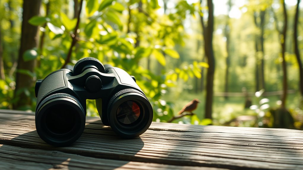 Weather resistance is a crucial factor to contemplate because it guarantees your binoculars can handle the unpredictable conditions you’ll encounter outdoors. Well-designed weather-resistant models feature sealed O-rings and nitrogen or argon purging, preventing water and moisture from entering the optics. Waterproof binoculars can even withstand immersion, making them perfect for rainy or wet environments. Fogproof features keep the internal lenses clear in humid conditions, ensuring you won’t lose sight of elusive birds. The durability of these binoculars means they perform reliably in snow, rain, and dew. Plus, materials like rubber armor offer a secure grip and protect against impacts and harsh weather. Investing in weather-resistant binoculars means your optics stay clear and functional, no matter what Mother Nature throws your way.