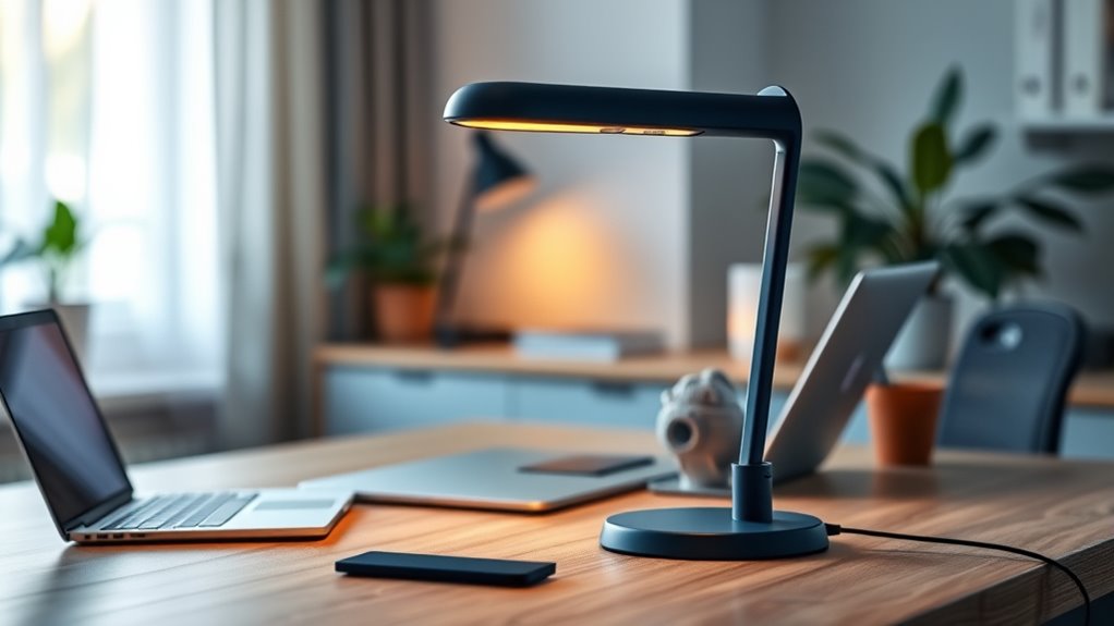 When selecting a blue light blocking desk lamp, considering its portability and size is essential for making sure it fits seamlessly into your workspace or travel routine. Compact, lightweight designs—usually under 2 pounds and less than 15 inches—make it easy to carry or move around. Foldable or adjustable arms allow quick setup and simple storage, perfect for changing environments. Built-in rechargeable batteries enable cordless use for hours without needing an outlet, ideal for working anywhere. USB ports built into the lamp add convenience, letting you recharge easily on the go. Slim profiles and minimal footprints make these lamps perfect for small desks, bedside tables, or travel bags. Prioritizing portability guarantees you enjoy effective blue light protection without sacrificing space or mobility.