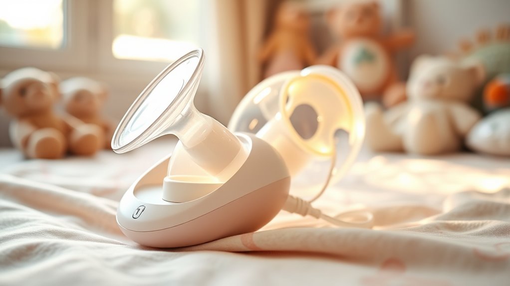 Since a quiet pump can make a big difference in your pumping experience, it’s important to contemplate noise levels when selecting a breast pump. Lower noise levels, around 40 dB or less, create a calm environment, helping you relax and potentially boosting milk flow. Quiet pumps are especially beneficial for late-night sessions or shared spaces, where disturbing others isn’t ideal. Electric models tend to be louder than manual or wearable options, so if discretion is a priority, choosing a quieter pump is smart. Reducing noise can also prevent your baby from becoming startled or distracted during feeding. Overall, a quieter pump helps maintain a peaceful atmosphere, making pumping more comfortable and less stressful. It’s a small feature that markedly impacts your overall experience.