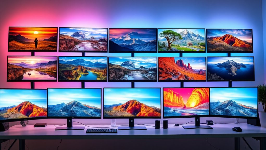 When selecting a budget 4K monitor, paying attention to color accuracy and HDR support is crucial for getting vibrant, true-to-life images. Look for monitors that cover at least 95% sRGB or DCI-P3, ensuring colors are vivid and precise. HDR support, like HDR10 or DisplayHDR 400, enhances contrast, brightness, and color depth, making images more immersive. Monitors with wider color gamuts and higher peak brightness deliver more detailed, realistic visuals, even on a budget. Accurate color reproduction is especially important for creative tasks like photo editing and graphic design. To guarantee your monitor meets expectations, check its color calibration and HDR specifications before buying. These features profoundly impact display quality, making your viewing experience more vibrant and true to life.