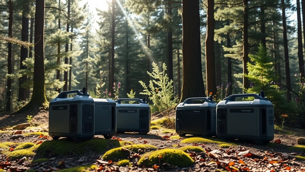 Safety features play a vital role in choosing a quiet camping generator, especially since you’ll be using it in outdoor environments where risks can arise unexpectedly. I look for generators with low-oil shutdown, which automatically turns off the engine if oil levels get too low, preventing damage. Carbon monoxide (CO) detection sensors are essential, as they shut down the generator if dangerous CO levels are detected, protecting my health. Overload protection circuits prevent exceeding safe power limits, avoiding electrical hazards and damage to devices. Ground fault circuit interrupters (GFCIs) help prevent shocks by shutting off power during ground faults. Additionally, circuit breakers and automatic shutdown systems ensure safe operation during power surges or electrical faults, giving me peace of mind during outdoor adventures.
