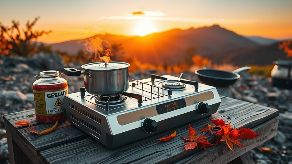 Safety features are vital components to contemplate in dual fuel camping stoves, as they directly impact your security during outdoor cooking. Many models come equipped with overpressure protection and gas flow cut-off mechanisms that prevent leaks and reduce the risk of accidents. Flame supervision systems and pressure sensors play a key role by detecting irregular gas flow or pressure issues, automatically shutting off the fuel supply when necessary. Safety locks on fuel canisters or adapters guarantee secure connections, minimizing disconnection risks during use. Additionally, some stoves include automatic ejection systems that eject cartridges if abnormal pressure is detected, preventing hazardous situations. Prioritizing these safety features helps guarantee your stove operates reliably, reducing fire hazards, gas leaks, and other dangers while you’re out enjoying your adventure.