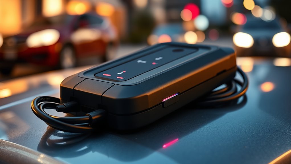 When selecting a car jump starter, size and weight are essential factors that affect how easily I can store and carry it. Compact models weighing under 3 pounds are highly portable, making them perfect for quick access in emergencies. They usually measure around 4 to 8 inches, so they fit comfortably in a glove box or emergency kit without adding bulk. Many portable jump starters feature integrated handles or sleek designs, facilitating effortless transport. While larger units might include extra features like power banks or air compressors, they tend to be less convenient to carry around. For frequent travelers or those with limited storage, lightweight models under 5 inches are ideal, ensuring I can quickly access the device whenever I need it without hassle.