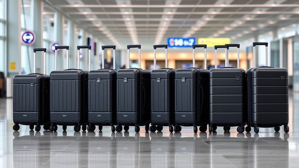 When choosing a carry-on with a removable battery, I focus on safety standards to guarantee reliable performance. I also consider size, weight, and charging options to match my travel needs. Finally, I look at durability and ease of removing the battery for convenience and security.