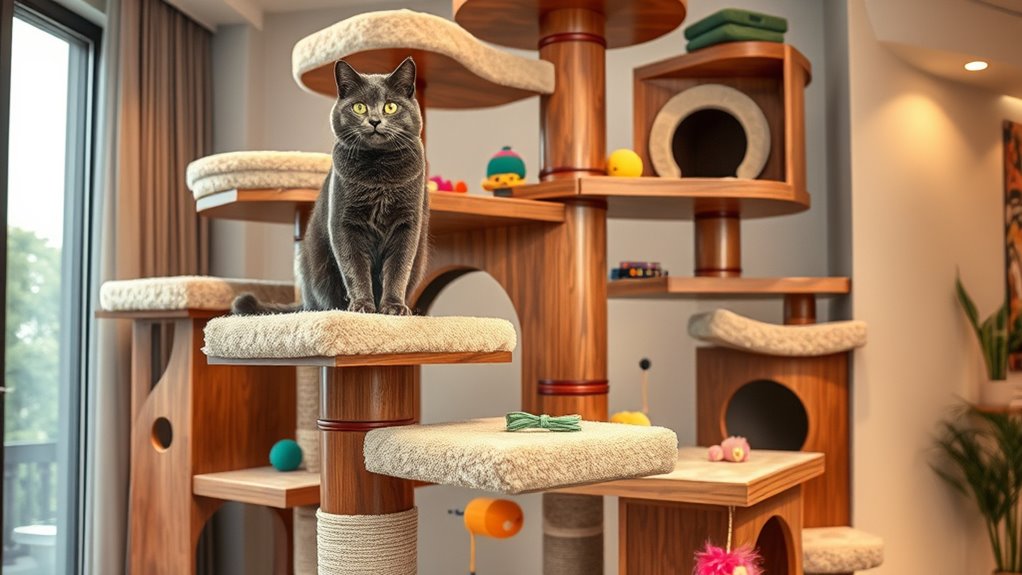 Multi-level features in a cat tree are essential because they mimic a cat’s natural climbing and resting behaviors, encouraging activity and mental stimulation. Multiple platforms and perches give cats opportunities to explore, jump, and observe their surroundings, which helps keep them physically active. Having various levels also reduces territorial disputes in multi-cat households by offering individual spaces for each cat. Elevated platforms serve as perfect vantage points, satisfying curiosity and hunting instincts. Many multi-tier structures include different resting spots like condos, hammocks, and perches, adding comfort and variety. Plus, a well-designed multi-level tree enhances your home’s aesthetic appeal while providing functional enrichment for your feline friends, ensuring they stay entertained and happy indoors.