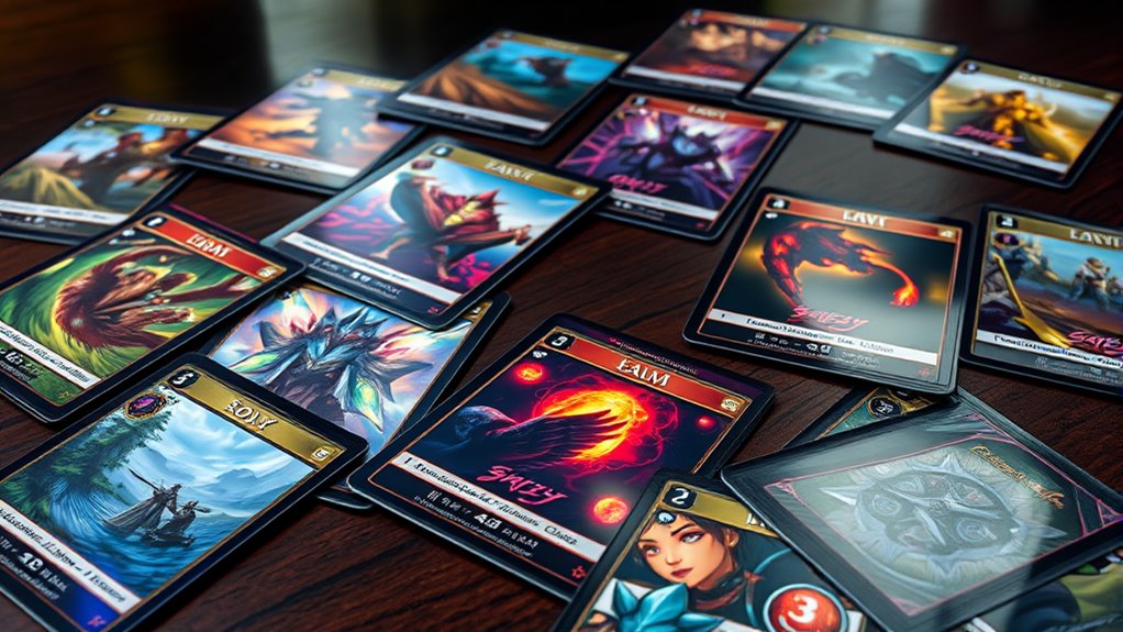 The artwork and design of trading cards play a crucial role in their visual appeal and overall desirability. High-quality, unique illustrations can deeply enhance the thematic immersion and foster an emotional connection for players and collectors alike. Variations like foil, holographic, or borderless styles not only add visual flair but also increase a card’s rarity and desirability. Consistent artistic themes within a set create a cohesive aesthetic, making collections more attractive and enjoyable to display. Additionally, limited-edition or original artwork can profoundly boost a card’s value, attracting serious collectors. When choosing a trading card game, pay close attention to the artistry—well-designed cards not only look fantastic but also elevate the overall gaming experience, making your collection stand out.
