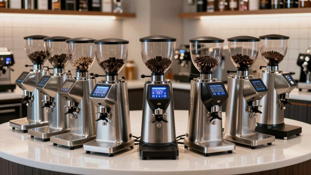 If you’re looking for the 15 best commercial espresso grinders for 2026, I’ve found some top options that deliver precise grind control, durability, and efficiency for high-volume use. From models with large burrs to advanced digital interfaces, these grinders help guarantee consistently excellent shots. Whether you run a busy café or an office, selecting the right equipment can make all the difference. Keep exploring, and you’ll discover insights to help you choose the perfect grinder for your needs.