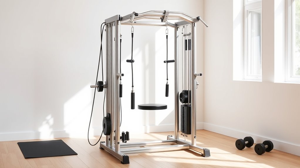 A compact home-gym cable machine’s true value lies in its versatility, allowing me to target multiple muscle groups with a single piece of equipment. With features like adjustable pulley heights and diverse attachments, I can perform exercises such as lat pulldowns, rows, chest presses, and arm curls, ensuring thorough workouts. Dual pulleys and multiple cable positions enable seamless progression between different movements, saving time and space. Compatibility with accessories like handles, bars, and ropes broadens my exercise options, maximizing workout variety in a limited area. Additionally, a well-designed machine provides smooth, consistent resistance across various motions, helping me train effectively while reducing injury risk. This adaptability makes it an essential investment for anyone seeking efficient, versatile home workouts.