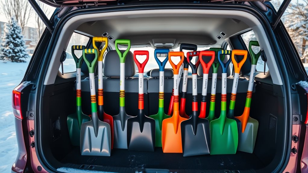 Choosing a compact snow shovel that fits easily into your car trunk hinges on its ability to fold or collapse into a small, manageable size. A shovel with a foldable or telescoping handle makes storage quick and effortless, conserving space when not in use. Lightweight design, ideally under 2 pounds, ensures you can handle it comfortably without adding extra weight to your vehicle. Durable materials like polypropylene or aluminum keep the shovel sturdy yet light, resisting deformation during storage. Even with a small, foldable profile, the shovel must still have enough blade width and strength to clear snow effectively around your car. Overall, a well-designed, space-saving snow shovel guarantees easy storage, quick access, and reliable performance when you need it most.