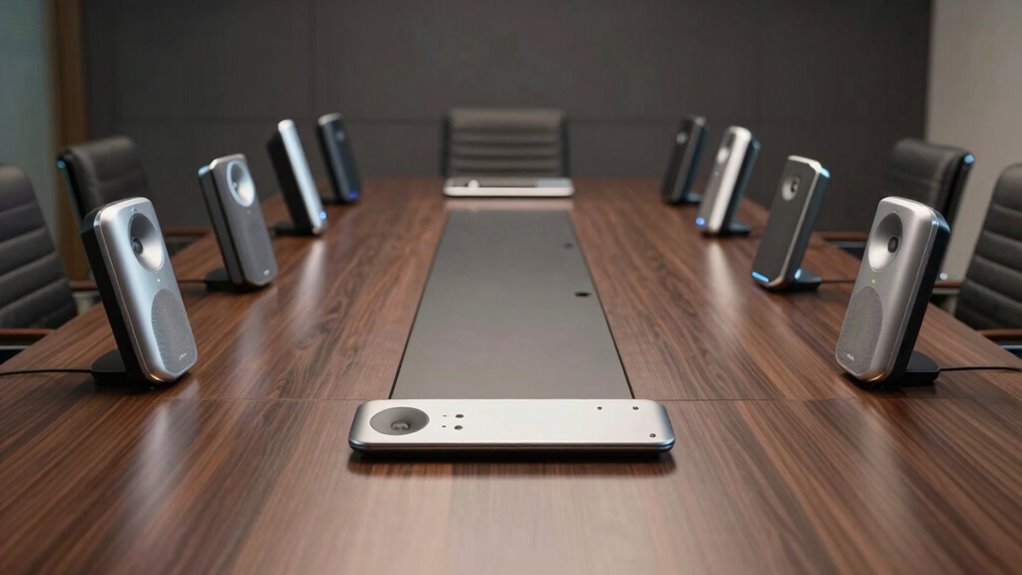 Premium speakerphones guarantee clear audio in large conference rooms by using advanced microphone arrays that capture sound from different angles and reduce background noise. They also incorporate noise-canceling technology and echo suppression, which help deliver crisp audio even in spacious environments. Additionally, high-quality speakers amplify voices clearly, and intelligent algorithms automatically enhance speech clarity, making sure everyone is heard loud and clear, no matter the room size.