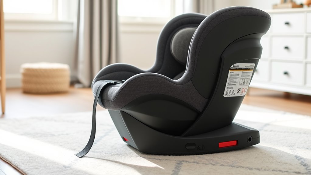 Durability and the quality of materials play an essential role in choosing a convertible car seat with a load leg, especially since these seats endure daily use and safety testing. High-strength plastics and reinforced metal components are common, ensuring the seat can withstand crash forces and regular wear. The fabrics used are typically sturdy and easy to clean, often with impact-absorbing foam for extra protection. To guarantee longevity, quality load leg seats feature corrosion-resistant metal frameworks, making them suitable for various weather conditions. The load leg itself is usually made from reinforced metal or high-impact plastic, engineered for stability and reduced seat rotation during a crash. These materials are rigorously tested through crash simulations and repeated load cycles, guaranteeing safety and durability over years of use.