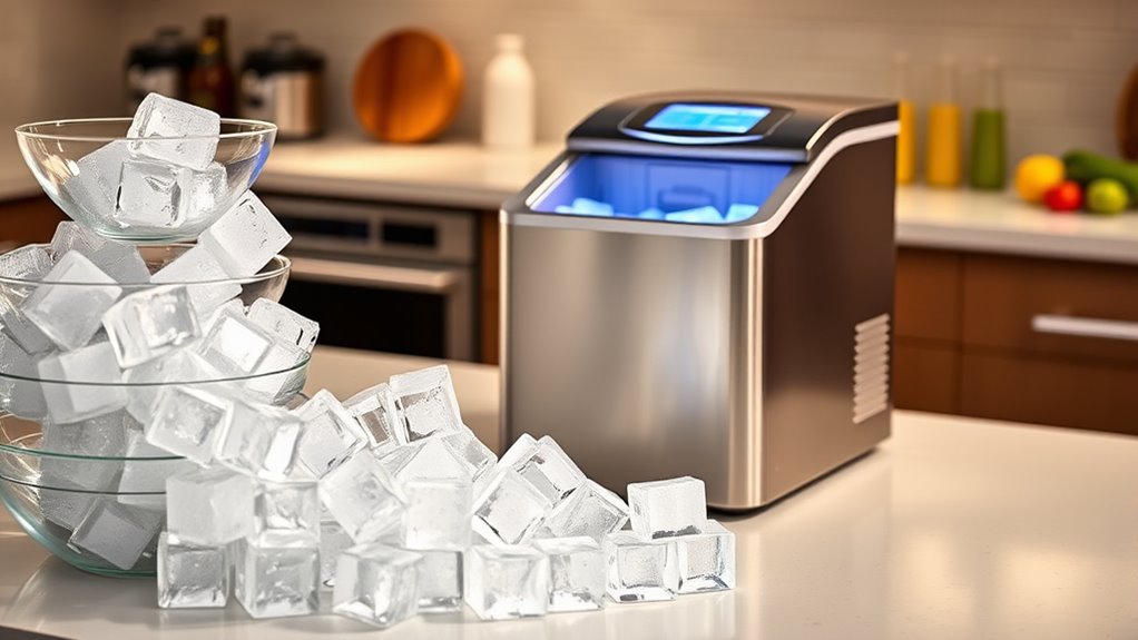 Choosing the right capacity and size for a countertop ice maker depends on how much ice you need and the space you have available. If you entertain often or have a busy household, look for models that produce between 15 to 26 pounds of ice daily. Compact units under 12 inches work well for small kitchens or limited counter space, but larger models may require more room. Many ice makers offer adjustable cube sizes, so you can choose small, medium, or large cubes for different drinks. Keep in mind that the ice basket usually holds 1 to 2.5 pounds of ice, meaning frequent refilling might be necessary for high-volume use. Matching capacity to your typical ice consumption guarantees you have enough without overcrowding your space.
