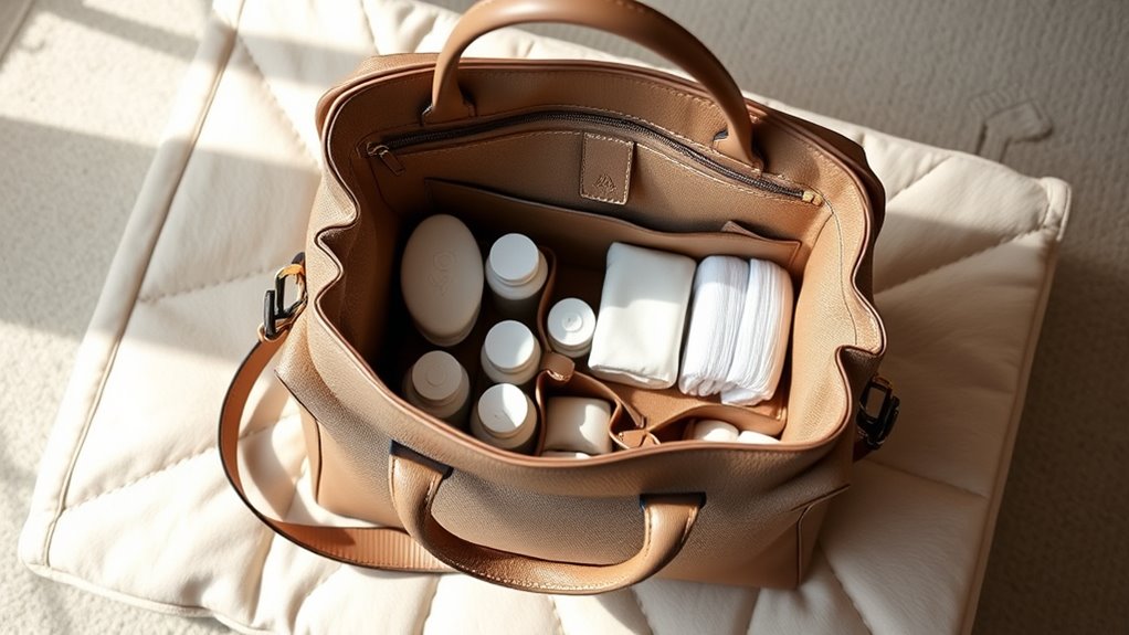 A stylish diaper bag isn’t just about looks—it needs to keep everything organized and within easy reach. To do that, I look for a bag with at least 15-26 liters of space, enough to hold diapers, bottles, wipes, clothes, and my personal items. Multiple compartments, like insulated pockets for bottles and zippered sections, help me keep items separate and easy to find. Internal dividers and adjustable compartments let me customize the layout, preventing clutter. External pockets and quick-access slots are lifesavers for essentials like keys, phone, or snacks, saving me time searching. Clear labeling or dedicated pockets make organization even more efficient, so I can grab what I need in a flash. Good storage and smart organization are key to stress-free outings.