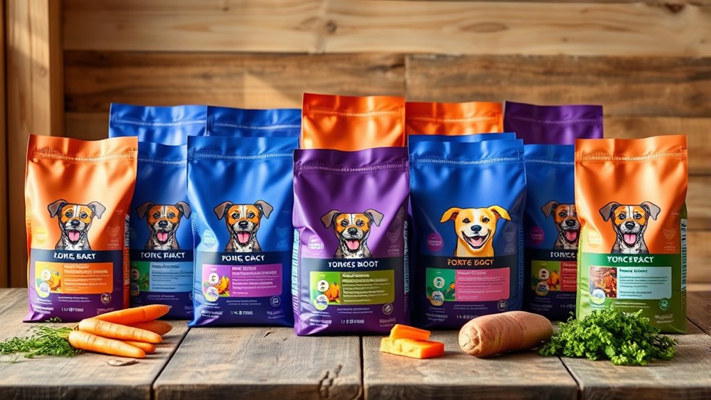 Since different dog breeds and ages have specific nutritional requirements, it’s vital to select a food that caters to these unique needs. Large breeds often need joint support formulas, while small breeds require higher energy density to sustain their activity levels. Age also plays a key role; puppies need more protein and calories to support rapid growth, whereas senior dogs benefit from reduced calories and added joint or cognitive support. Choosing a breed- and age-specific formula helps guarantee your dog gets the right balance of nutrients for excellent health and activity. Consulting with a veterinarian can guide you toward the best options tailored to your dog’s size, age, and health considerations. Making the right choice supports your dog’s overall well-being and happiness.