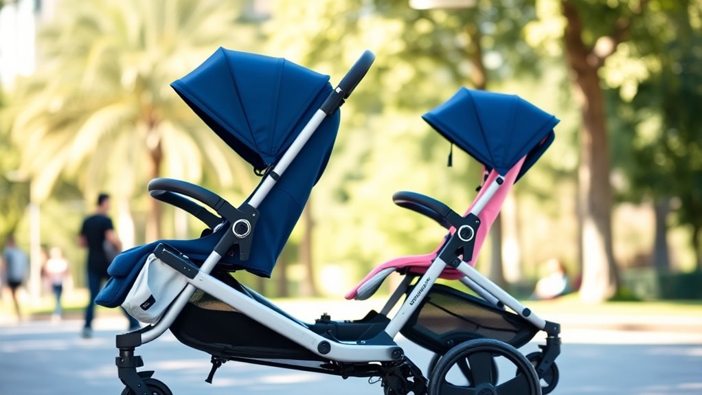 Have you considered how seat versatility can enhance your travel experience with a double stroller? Flexible seating options ensure your kids stay comfortable, whether they want to sit upright or nap. Look for strollers with adjustable or multi-position recline features to give each child personalized comfort. Some models offer removable or convertible seats, adapting to different ages and needs. Independent seat adjustments are also valuable, letting each child customize their position without affecting the other. Repositionable canopies or sunshades help provide adequate coverage for both kids, regardless of the sun’s angle. Additionally, versatile configurations like side-by-side or tandem layouts offer convenience and adaptability for various travel environments. Prioritizing seat versatility makes your outings smoother and more enjoyable for everyone.