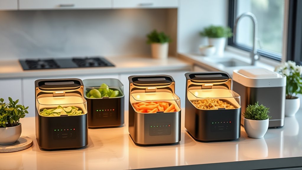 If you’re looking for eco-friendly, convenient electric compost bins for your kitchen in 2025, I recommend the NutriChef Electric Kitchen Composter, a 3-quart unit that quickly turns waste into pre-compost, and the compact 4L model that’s odorless and highly efficient. The Vitamix FC-50 combines a food processor with recycling features, while the 3L compact bin offers versatility with dual modes. The Airthereal Revive is great for crushing waste quietly. Keep in mind space, odor control, and ease of use to find the best fit—you’ll discover more options that suit your needs.