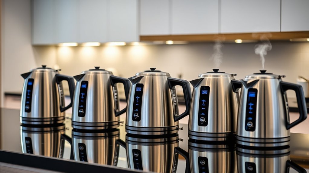 Choosing an electric kettle with precise temperature control means paying attention to how accurately and consistently it can heat water to your desired setting. Many models offer temperature adjustments in 1°F to 5°F increments, giving you fine-tuned control for different beverages. Some come with preset options for popular drinks like green tea, black tea, or coffee, making brewing simpler. Digital displays are also common, showing real-time water temperature so you can monitor and adjust as needed. The best kettles can maintain your selected temperature for hours—anywhere from 1 to 12 hours—adding flexibility to your brewing routine. These features rely on reliable thermistor or thermostat technology, ensuring consistent heating and precise regulation every time you use the kettle.