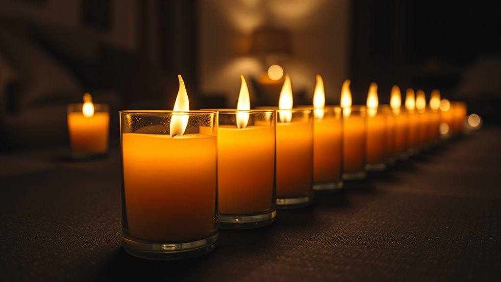 Selecting emergency candles with long burn times requires paying close attention to their materials and safety features. I recommend choosing candles made from high-quality, non-toxic materials like paraffin wax, beeswax, or liquid paraffin, which ensure safe and reliable burning. Make sure the wicks are lead-free and cotton, as this prevents harmful fumes and promotes a clean, smokeless flame. Safety features like stable, weighted bases or durable containers are essential to prevent tipping and reduce fire risks. I also look for candles that emit minimal drips and smoke, helping maintain indoor air quality and keeping mess to a minimum. Finally, double-check that the candles are certified or tested for safety standards, giving me confidence they’re suitable for emergency use and handling.