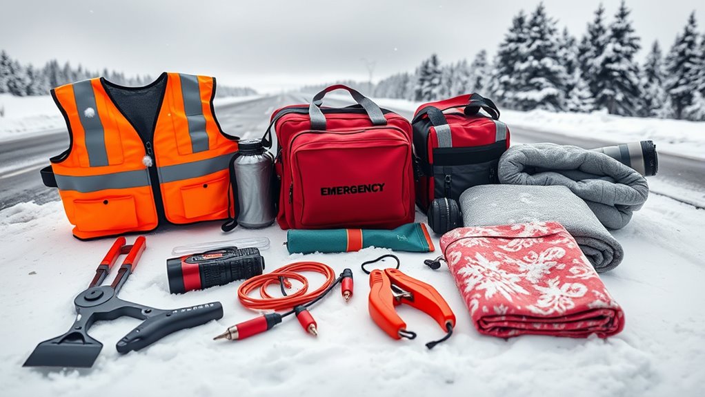 Choosing the right additional emergency supplies for your snow travel kit can make all the difference during unexpected stops. Items like first aid kits, reflective vests, and warning triangles boost safety if you’re in an accident or your vehicle breaks down. Thermal blankets, hand warmers, and extra clothing help keep your body heat intact when stranded in cold weather. A multi-purpose toolset with screwdrivers, pliers, and a flashlight is essential for roadside repairs and improving visibility. Snow brushes, ice scrapers, and portable shovels make clearing snow and ice easier, ensuring safer driving conditions. Additionally, packing bottled water, non-perishable snacks, and spare batteries can keep you comfortable and sustained during emergencies. Carefully selecting these supplies guarantees you’re prepared for winter’s challenges on the road.