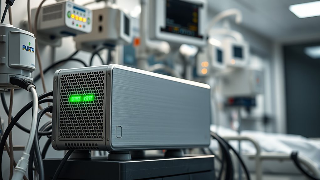 Choosing the right emergency power supply for medical equipment requires carefully evaluating your devices’ power needs. First, assess the total wattage and voltage requirements to determine the minimum capacity needed. Consider how long you’ll need backup power during outages to select an appropriately sized battery or generator. It’s also essential to verify that the power supply can support multiple devices simultaneously without overloading. Pay attention to surge wattage and peak power needs, especially during startup, to ensure the power source can handle initial loads. Lastly, check that the battery capacity—measured in Wh or Ah—is sufficient to keep your critical devices running for the necessary duration. Properly sizing your power capacity guarantees uninterrupted care when it matters most.