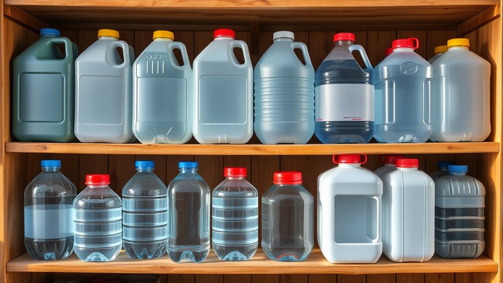If you want to be truly prepared, choosing the right emergency water containers is key. I recommend a mix of durable, BPA-free tanks like 5-gallon jugs, collapsible BPA-free bags for portability, and larger units like WaterBobs or 55-gallon drums for long-term storage. Proper features such as leak-proof spigots, impact-resistant walls, and UV protection matter too. To guarantee your safety when emergencies strike, explore these top options to find what fits your needs best.