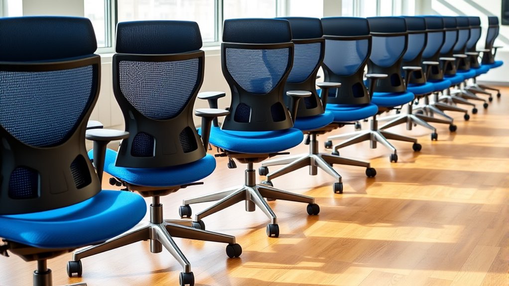 Since space is often limited in home offices or small work areas, selecting an ergonomic chair with space-saving features can make a significant difference. Chairs with flip-up or foldable armrests allow you to slide them easily under desks, freeing up valuable room. Compact designs, typically around 20-25 inches wide, help maximize floor space without sacrificing comfort. Adjustable height and reclining functions enable personalized support while keeping the chair’s footprint minimal. Many models feature sleek, minimalist aesthetics that blend seamlessly into different environments, maintaining style alongside function. Additionally, lightweight construction and easy assembly make repositioning quick and effortless, enhancing overall workspace flexibility. These space-saving features are essential for creating an efficient, comfortable, and clutter-free home office setup.