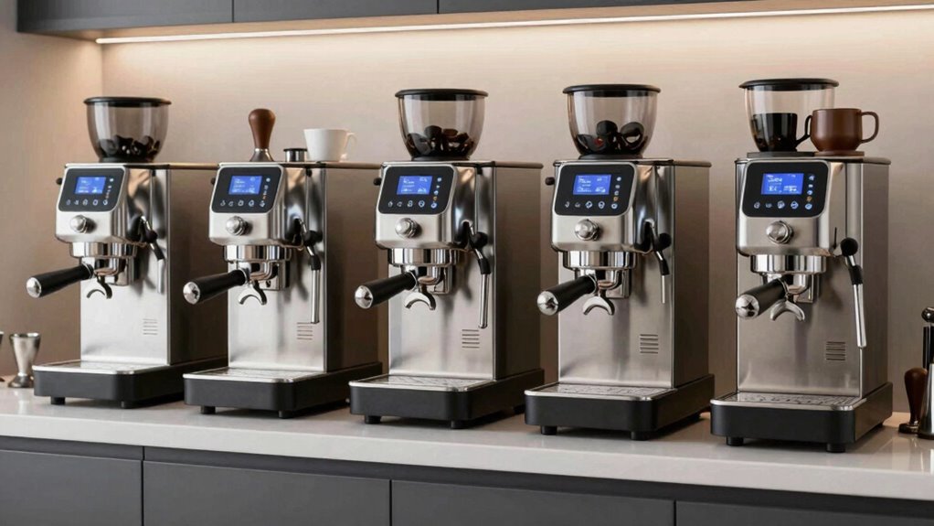 If you’re looking for the top dual boiler prosumer espresso machines in 2026, I’ve got you covered. These machines combine professional-grade features like precise temperature control, powerful pumps, and built-in grinders to help you craft café-quality espresso at home or in small cafes. They’re perfect for serious coffee lovers who want efficiency and consistency. Keep exploring, and you’ll discover detailed insights to help you pick the perfect model for your needs.
