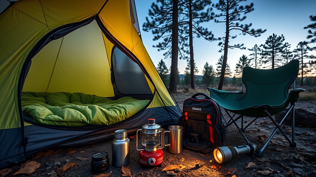 Choosing gear that offers multiple functions can substantially streamline your packing and enhance your outdoor experience. Multi-purpose items, like a headlamp with adjustable brightness and SOS modes, make it easier to adapt to different conditions without carrying extra gear. Multi-use tools, such as survival kits with first aid supplies and emergency gear, boost your preparedness for various scenarios. Convertible gear, like water bottles with built-in filters or cookware that doubles as storage, maximizes utility in limited space. These options not only save weight and space but also guarantee you meet essential needs efficiently. By selecting versatile gear, you reduce clutter and increase your flexibility, making your outdoor adventure smoother and more enjoyable. Multi-functionality truly elevates your camping experience by combining convenience and practicality.