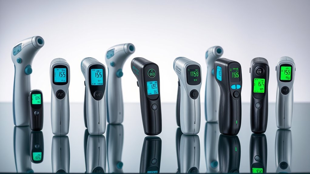 Measurement speed and accuracy are critical factors to evaluate because they directly impact how reliable and efficient a non-contact thermometer is. These devices typically give results within 1 to 2 seconds, making them ideal for quick assessments. However, accuracy varies depending on sensor quality and correct usage, usually ranging from ±0.2°F to ±2%. To get precise readings, maintaining the proper distance—usually 1 to 2 inches—is indispensable. Environmental factors like room temperature, humidity, and surface emissivity can influence both speed and accuracy, so controlling the environment helps. Regular calibration and consistent technique are essential for reliable results over time. Balancing fast response times with dependable accuracy ensures the thermometer provides trustworthy readings whenever you need them.