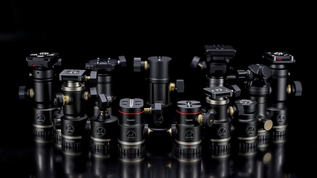 Choosing a fluid tripod head that seamlessly integrates with your equipment starts with checking compatibility. First, verify the head has the right mounting interface, like 1/4-inch or 3/8-inch screws, to match your camera or accessories. Next, confirm that it supports your camera’s weight and size—most heads handle between 3kg and 10kg (6.6 to 22 lbs). If you plan to switch between tripod and handheld setups, validate compatibility with quick-release plates. Also, examine if the mounting base, such as a 75mm bowl or flat base, fits your tripod or monopod. Finally, consider any additional threaded or socket connections needed for accessories like monitors, microphones, or lights. Proper compatibility ensures a secure, efficient setup for smooth, professional footage.