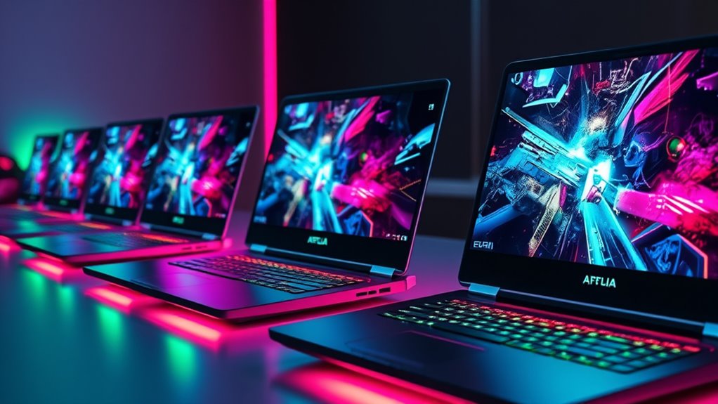 If you’re aiming for top-tier gaming performance in 2025, these laptops with RTX graphics are my top picks. I know some might worry about price or portability, but imagine this: a sleek device packed with powerful specs, ready to handle any game at high settings, all while fitting comfortably in your backpack. Investing in one of these means no compromises—just pure gaming power wherever you go.