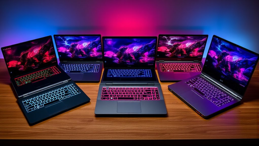 If you’re looking for the best gaming laptops under $1,000, I recommend focusing on models with powerful processors like AMD Ryzen 7 or Intel Core i7, combined with dedicated GPUs such as the RTX 4050 or Radeon Graphics. An IPS display with a high refresh rate (120Hz+), at least 8GB of RAM, and fast SSD storage are essential for smooth, responsive gaming. If you want to discover more options and details, keep going to find your perfect fit.