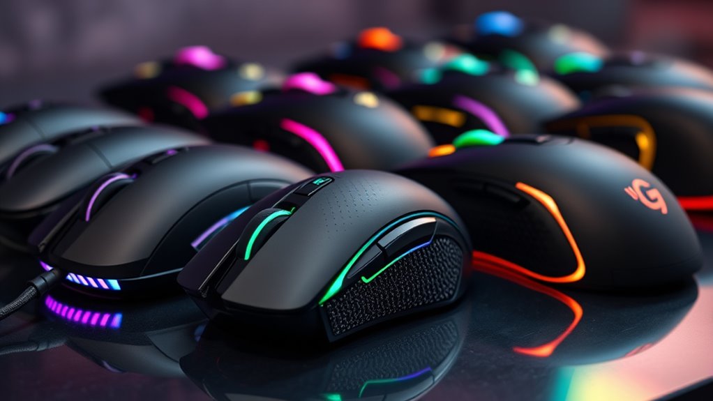 Lighting and aesthetic options play a significant role in customizing your gaming mouse to match your style and enhance your overall experience. Many gaming mice feature RGB lighting with over 16.8 million customizable colors, so you can easily match your setup or team colors. Dynamic modes like breathing, rainbow, and reactive effects add visual flair and create an immersive gaming environment. Some mice even support synchronized lighting that reacts to in-game events, music, or notifications, making your setup more engaging. You also have the option to turn off lighting to save power or reduce distractions. Customization through software or onboard controls allows you to identify profiles quickly and maintain aesthetic consistency, making your gaming experience both personalized and visually appealing.