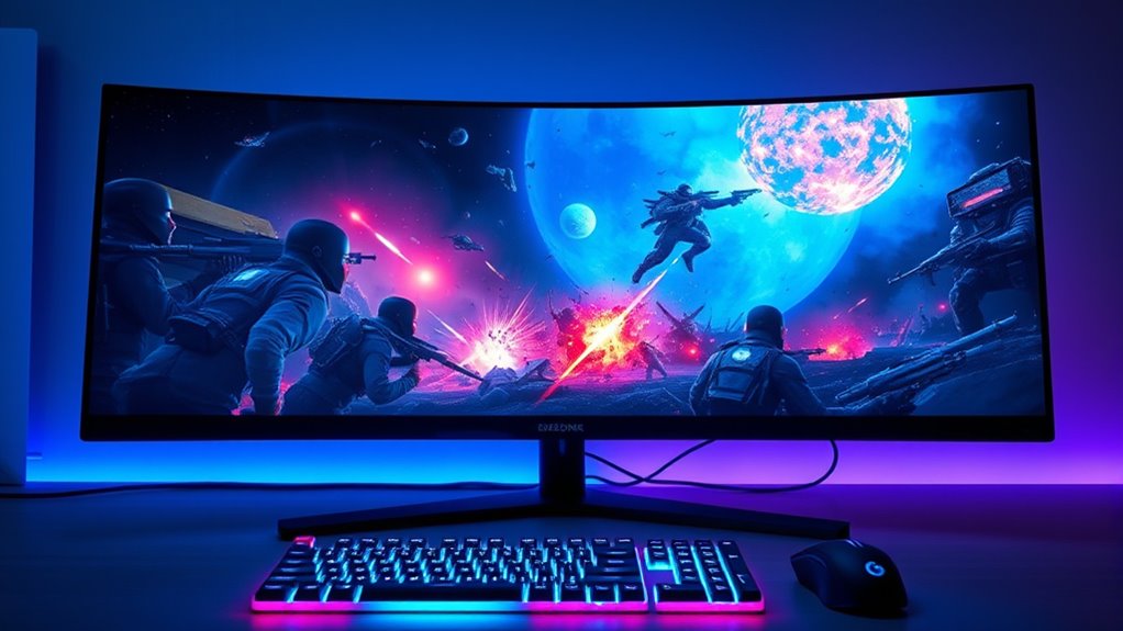 Choosing a gaming monitor with a 144Hz refresh rate involves more than just performance specs; ergonomic design plays a key role in ensuring comfort during long gaming sessions. An adjustable stand with tilt, swivel, height, and pivot features allows me to customize my setup for maximum comfort, reducing strain. Curved monitors with a radius of 1500R to 1800R help align the screen with natural eye movement, minimizing eye fatigue. VESA compatibility offers flexible mounting options, so I can position my monitor exactly where I need it. Features like low blue light modes and flicker-free technology are essential for reducing eye discomfort during extended play. Additionally, ultra-slim bezels improve aesthetics and support seamless multi-monitor setups, enhancing my overall gaming experience.